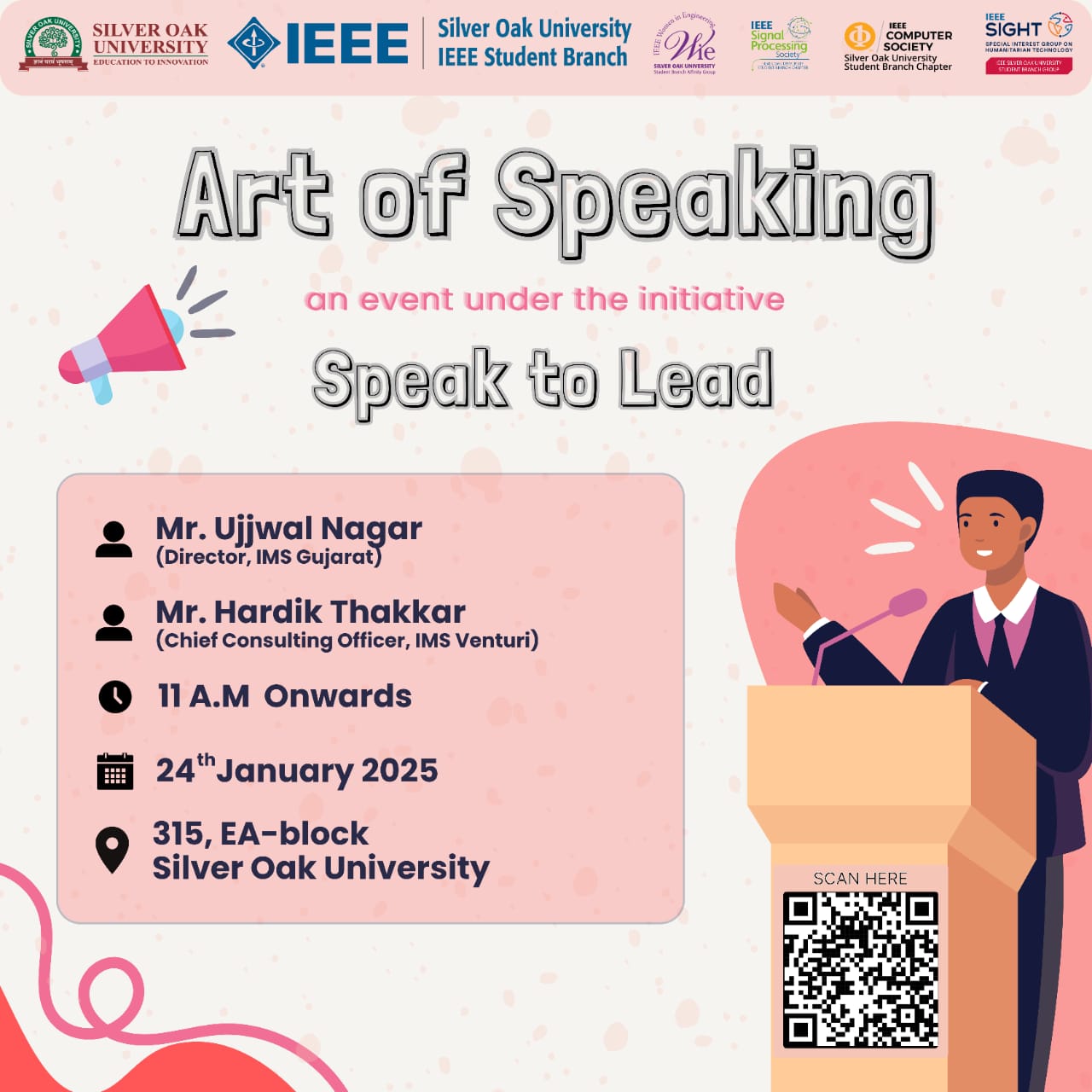 Get ready for a thrilling journey of empowerment at “Art of Speaking”, an event under SPEAK TO LEAD, initiative by Silver Oak University IEEE Student Branch. 🎙