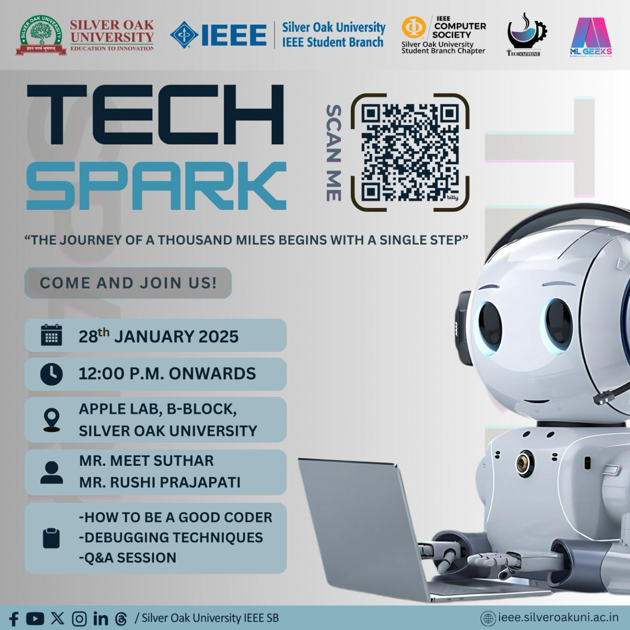👾 Be a part of “TechSpark”, an exciting event under TECHCaffeine by IEEE SOU CS SBC and MLGeeks club. Enhance your coding and debugging skills by solving innovative problem statements designed to push your limits.