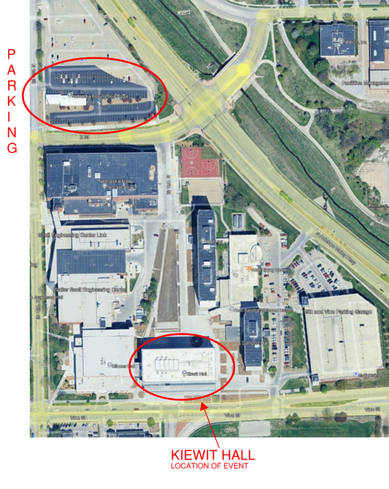 Note: Parking is in the Faculty/Staff Parking Lot A located at the corner of 16th & X Streets, north of Kiewit Hall. Enter parking lot from 16th Street.