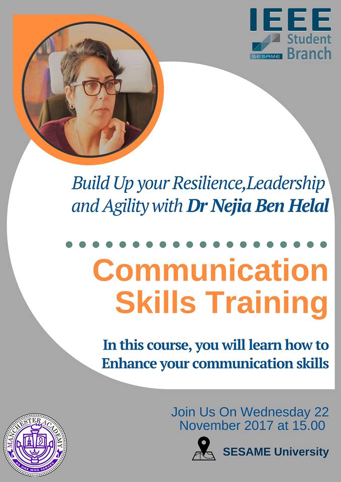 IEEE SESAME Student Branch will organize a Communication Skills Training which will take place on Wednesday November 22nd 2017 at SESAME University from 15:00 to 17:00 and will be led By Dr. Nejia Ben Hellal Founder and Director ofManchester Academy.