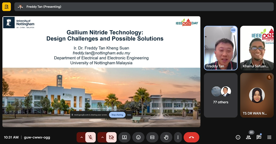 - Assoc. Prof. Ir. Dr. Freddy Tan Kheng Suan (University of Nottingham Malaysia) shared “Gallium Nitride Technology: Design Challenges and Possible Solutions”, highlighting real-world applications and limitations of GaN technology in modern power systems.