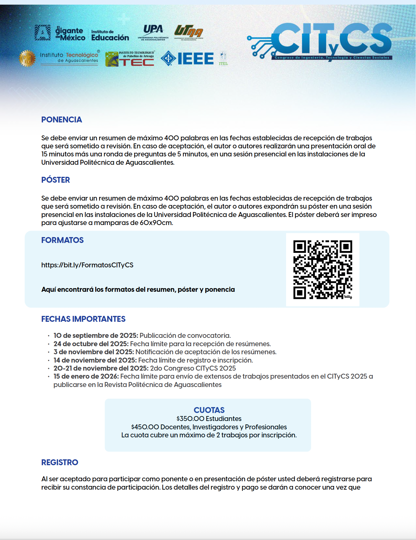 To promote research by disseminating the work carried out by the scientific community in Engineering, Technology, and Social Sciences, providing a space for interaction among specialists in these fields. This reinforces the ties between various academic and research institutions, fostering dialogue on the diverse issues affecting the state of Aguascalientes and Mexico.