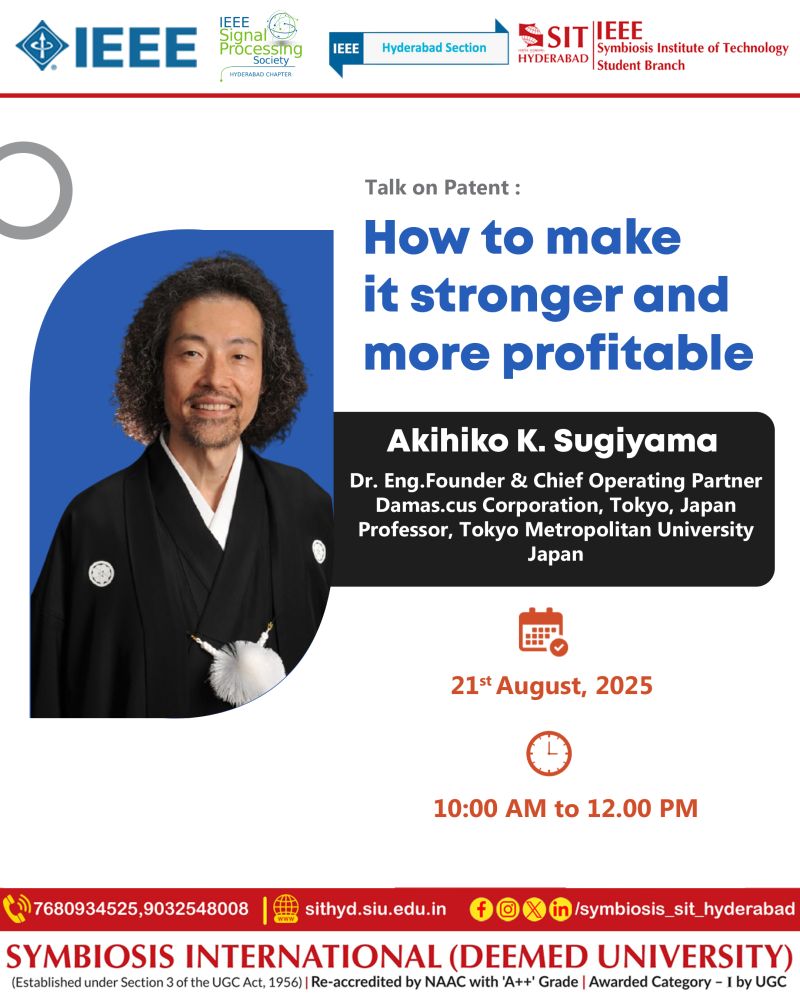 The IEEE Symbiosis Institute of Technology Hyderabad Student Branch and IEEE SPS Hyderabad Chapter, in collaboration with the IEEE Hyderabad Section, are delighted to host a Distinguished Talk by Dr. Akihiko K. Sugiyama, Founder & Chief Operating Partner of Damas.cus Corporation, Tokyo, Japan, and Professor at Tokyo Metropolitan University.
