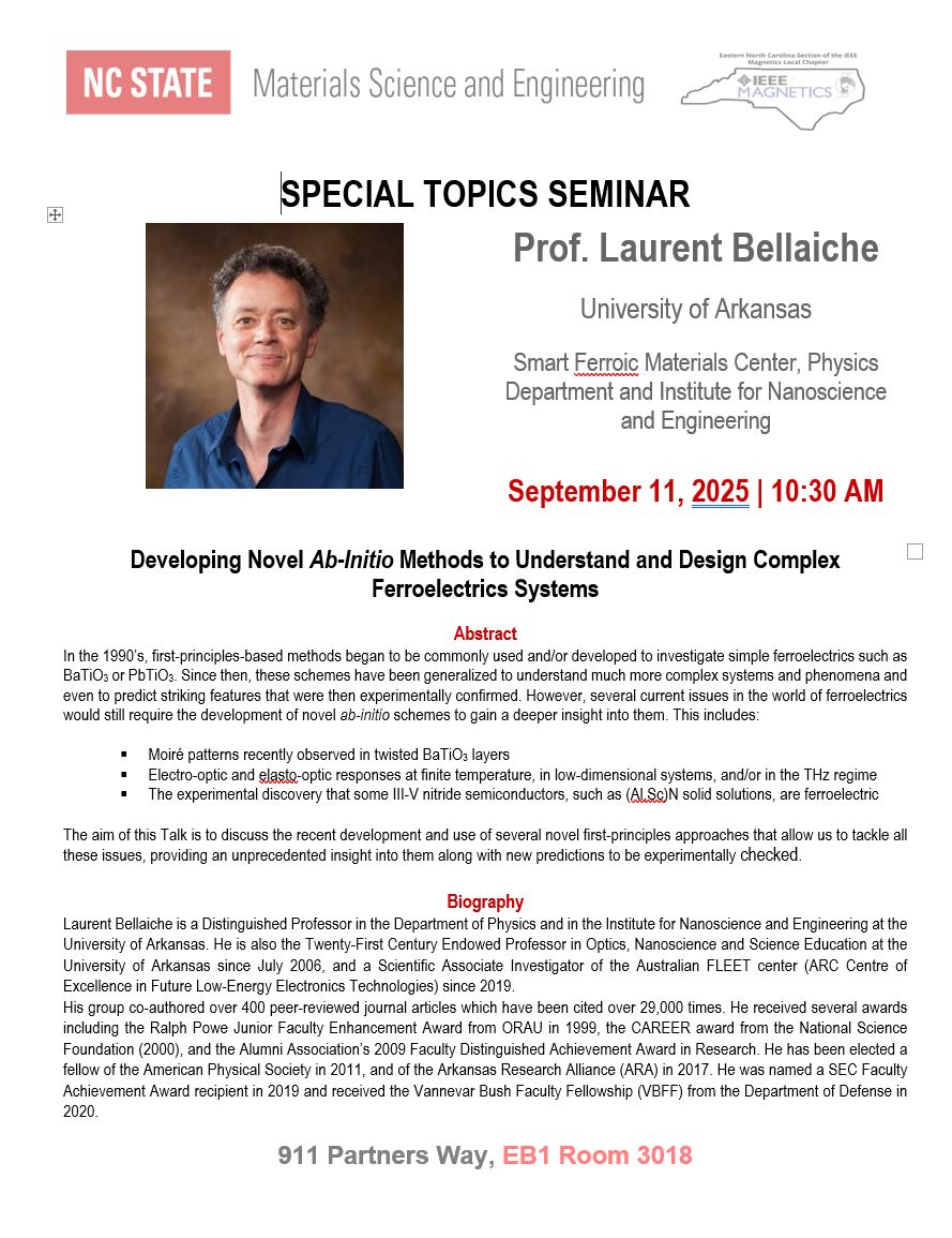 IEEE MagSoc NC Chapter Special Seminar and NCSU Special Topic Seminar - Prof. Prof. Laurent Bellaiche, University of Arkansas