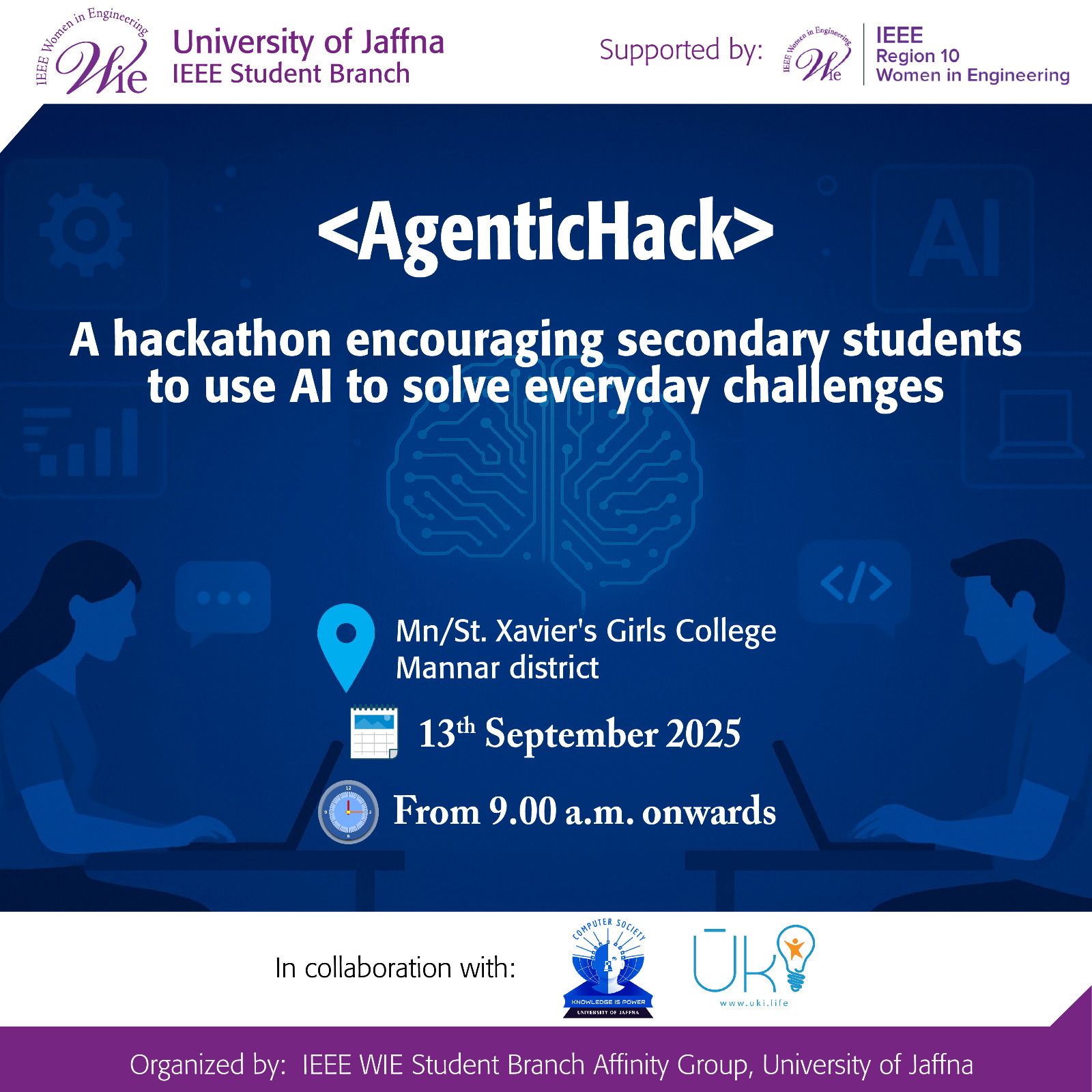 The IEEE Women in Engineering Student Branch Affinity Group of the University of Jaffna is excited to present Agentic Hack 2025, a one-of-a-kind hackathon designed exclusively for secondary school students. This unique event aims to empower young minds to harness the power of Artificial Intelligence in solving real-life challenges. It’s not just a competition, but a platform for creativity, innovation, and technology to come together, inspiring the next generation of problem-solvers and change-makers.
