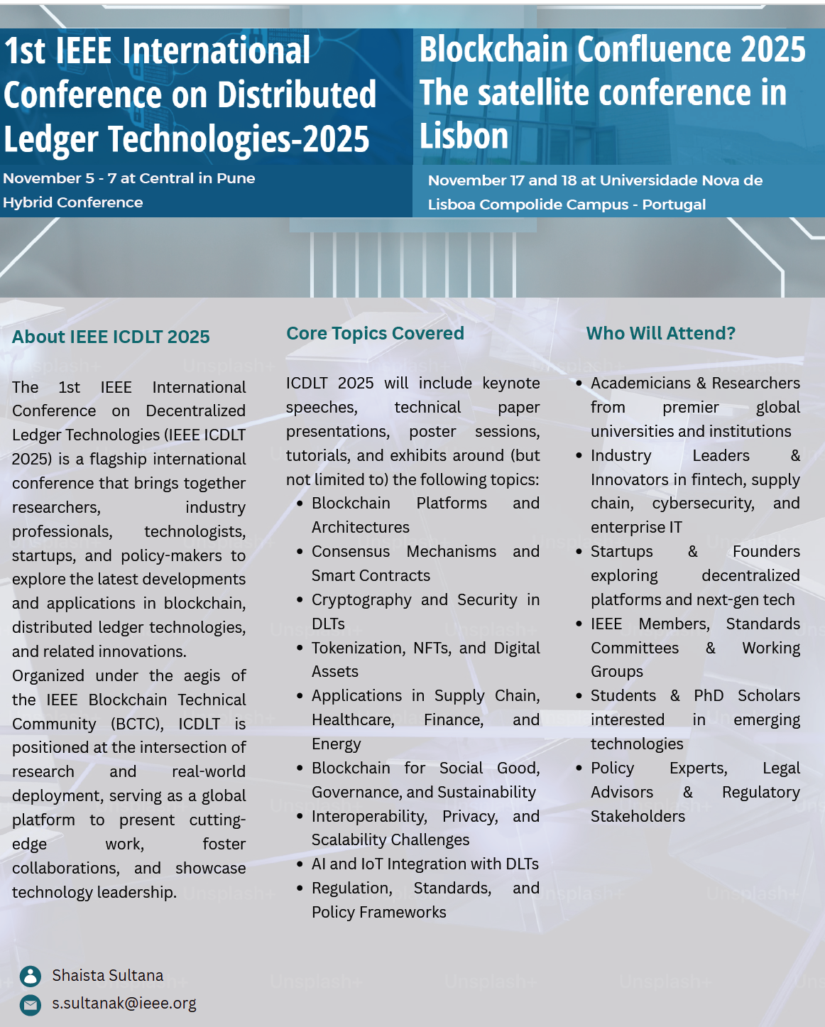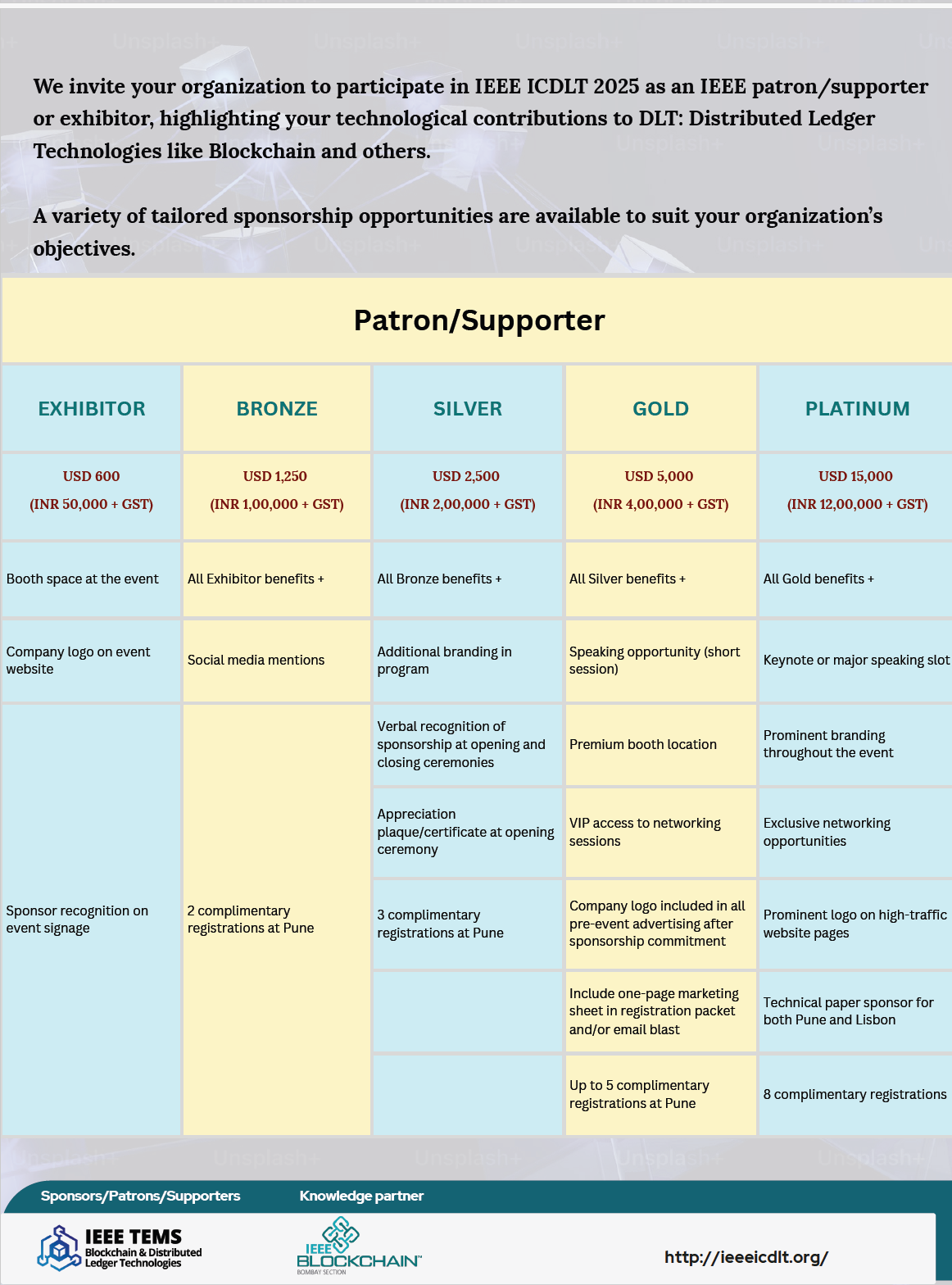 We invite your organization to participate in IEEE ICDLT 2025 as a IEEE patron/supporter or exhibitor, highlighting your technological contributions to DLT: Distributed Ledger Technologies like Blockchain and others.