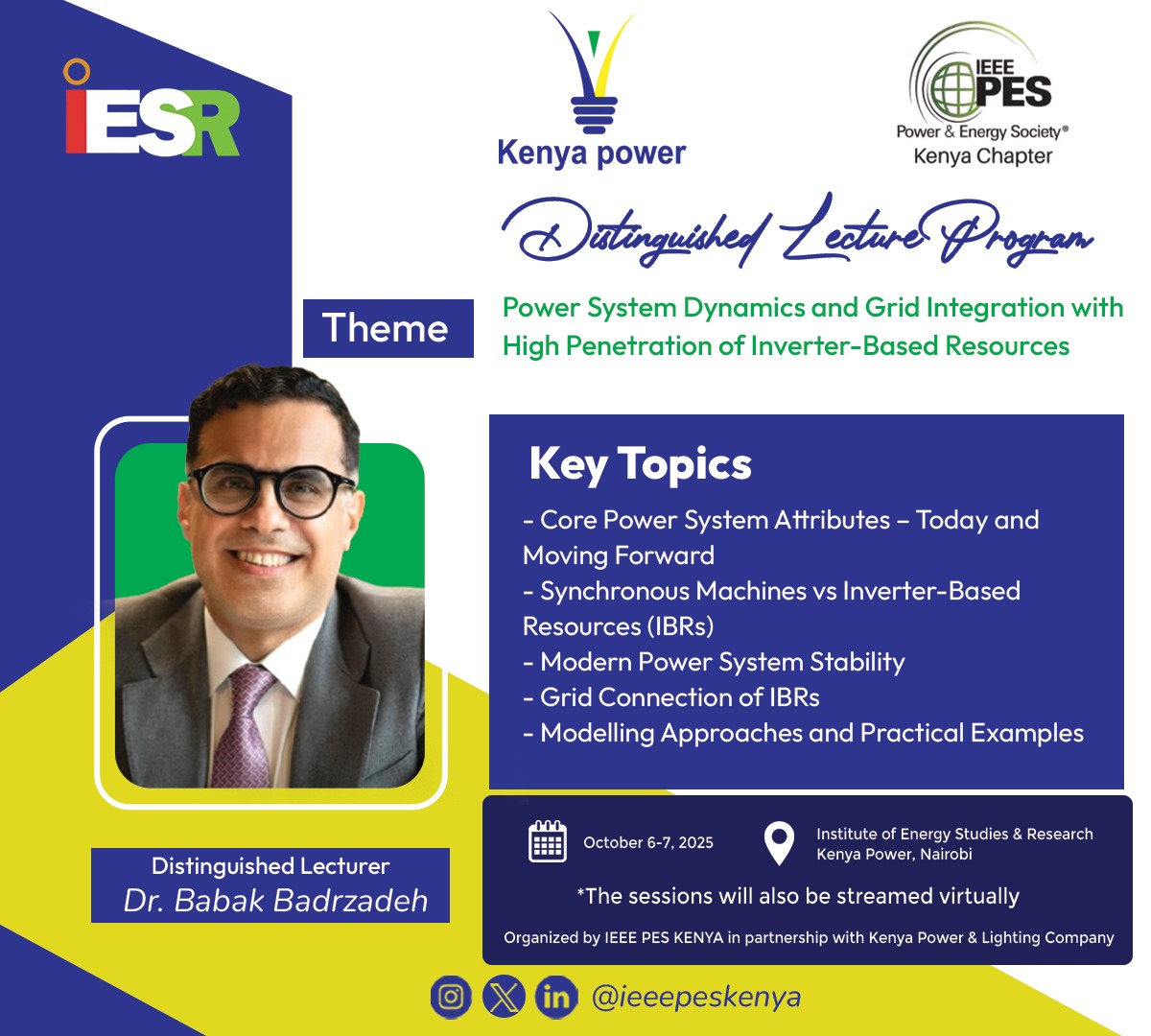The IEEE PES Kenya Chapter, in collaboration with the Kenya Power & Lighting Company (KPLC), is hosting a Distinguished Lecture Program featuring Dr. Babak Badrzadeh, IEEE PES Distinguished Lecturer. This lecture will explore power system dynamics and the integration of inverter-based resources, addressing modern stability challenges and practical approaches for renewable-ready grids. The event will bring together engineers, researchers, industry experts, and students to share knowledge and foster collaboration in advancing resilient power systems.