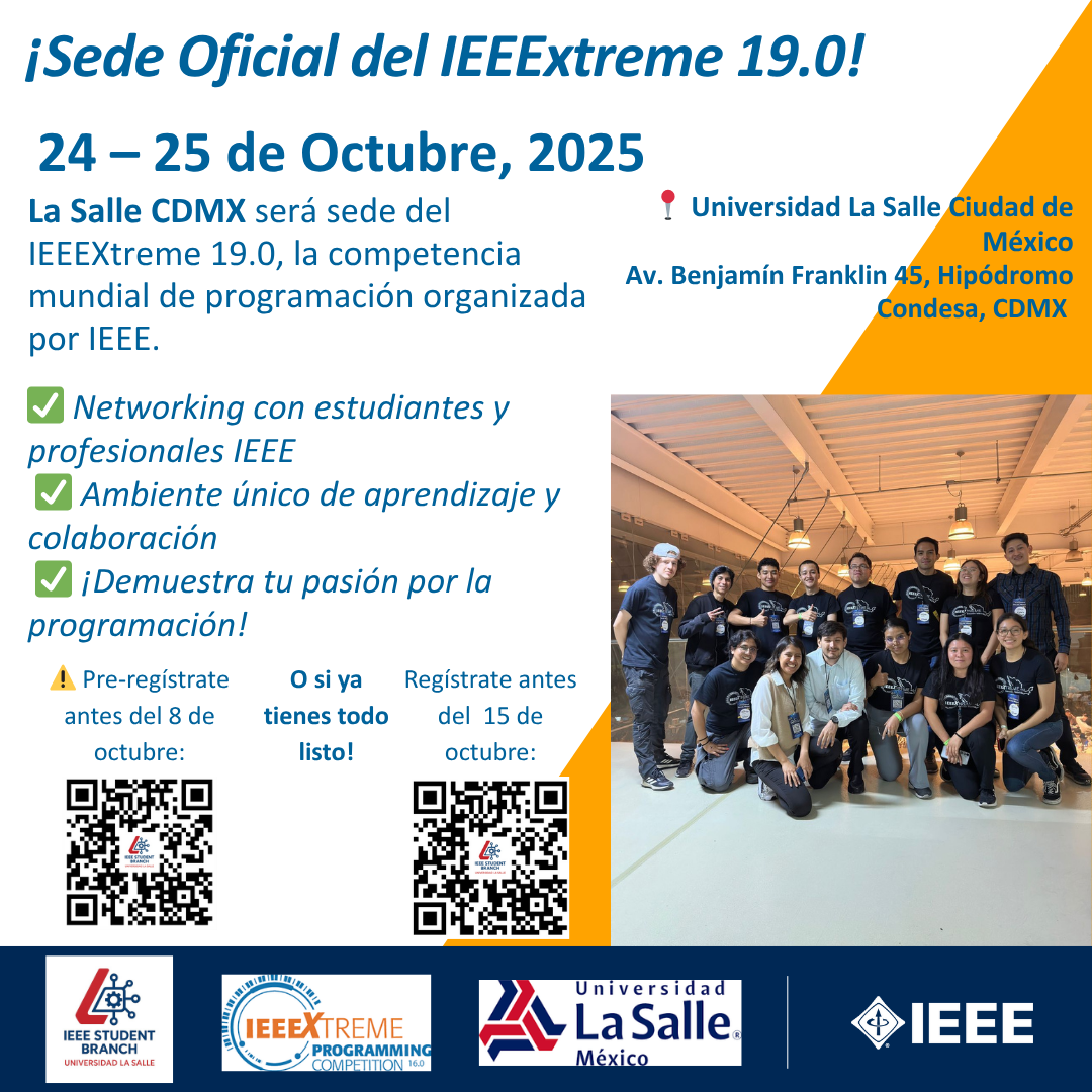 La Universidad La Salle Ciudad de México será sede oficial del IEEEXtreme 19.0, la competencia mundial de programación organizada por IEEE. Durante 24 horas ininterrumpidas, estudiantes apasionados por la tecnología y el código se reunirán en nuestro campus para resolver retos de programación de nivel internacional, colaborar en equipo y demostrar su talento frente a la comunidad global de IEEE.