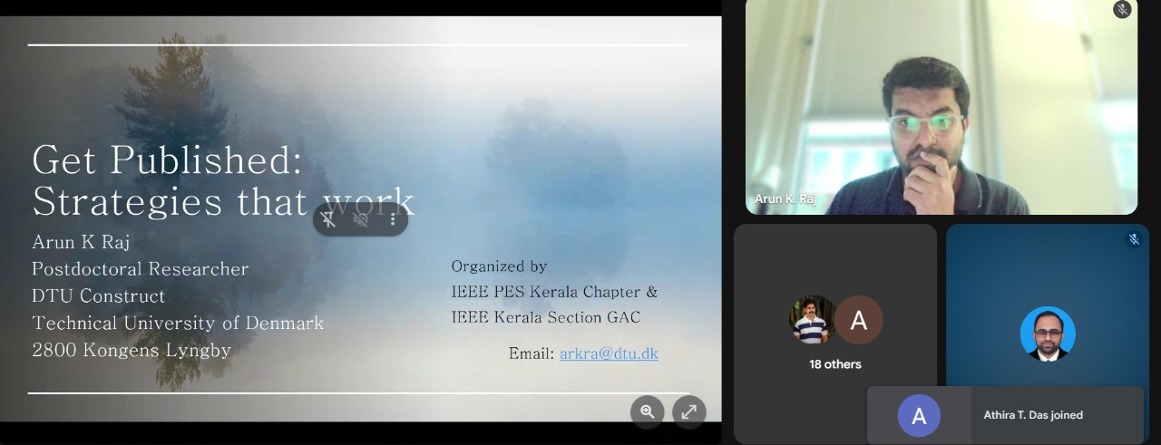 An insightful session titled “Get Published: Strategies That Work” was successfully organized by IEEE PES Kerala Chapter in collaboration with IEEE Kerala Section GSAC on 4th October 2025 via an online platform. The session was led by Dr. Arun K Raj, Postdoctoral Researcher at the Technical University of Denmark, who shared practical strategies and valuable tips for achieving success in academic publishing.