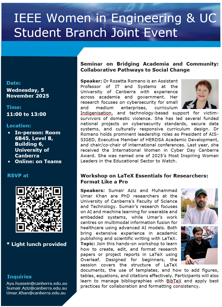 Sumair Aziz and Muhammad Umar Khan are PhD researchers at the University of Canberra’s Faculty of Science and Technology. Sumair’s research focuses on AI and machine learning for wearable and embedded systems, while Umar’s work centres on multimodal information fusion for healthcare using advanced AI models. Both bring extensive experience in academic publishing and scientific writing with LaTeX.
