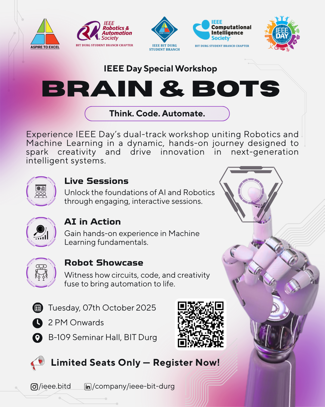 The BRAIN & BOTS Workshop, conducted by the IEEE Computational Intelligence Society (CIS) and Robotics and Automation Society (RAS) at BIT Durg, was a highly engaging and hands-on learning experience for students, held on 07th October 2025. The workshop aimed to introduce participants to the fundamentals of Artificial Intelligence (AI), Machine Learning (ML), and Robotics, while providing practical exposure to real-world applications and emerging technologies.