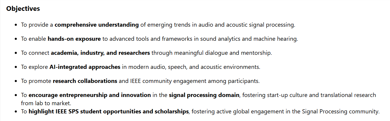 The 2025 Cycle 2 IEEE Signal Processing Society (SPS) Seasonal School on “Future Perspectives in Audio and Acoustic Signal Processing in Recent Advances” will be hosted at Symbiosis Institute of Technology (SIT), Pune, from 27th to 31st January 2026. Organized in collaboration with the IEEE Maharashtra Section, IEEE Gujarat Section, and their respective IEEE SPS Chapters, this premier academic event aims to bring together leading researchers, educators, and industry professionals to explore the next-generation trends in audio and acoustic signal processing. The school will feature expert-led lectures, hands-on sessions, and interactive discussions focusing on cutting-edge topics such as spatial audio, acoustic scene analysis, speech enhancement, AI-driven auditory modeling, and immersive sound technologies. Participants will gain valuable insights into emerging research directions, real-world applications, and collaborative opportunities that shape the future of signal processing for audio and acoustics.