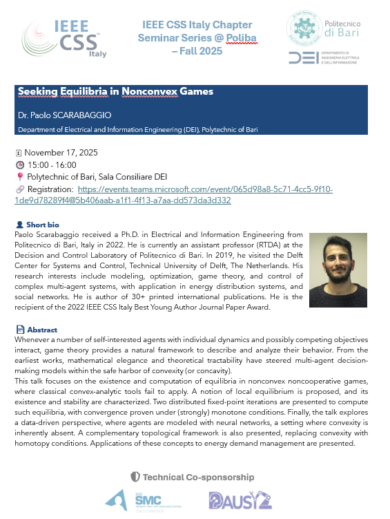 [IEEE CSS Italy Chapter Seminar Series @ Poliba β Fall 2025] Seeking Equilibria in Nonconvex Games - Dr. Paolo SCARABAGGIO, Polytechnic of Bari