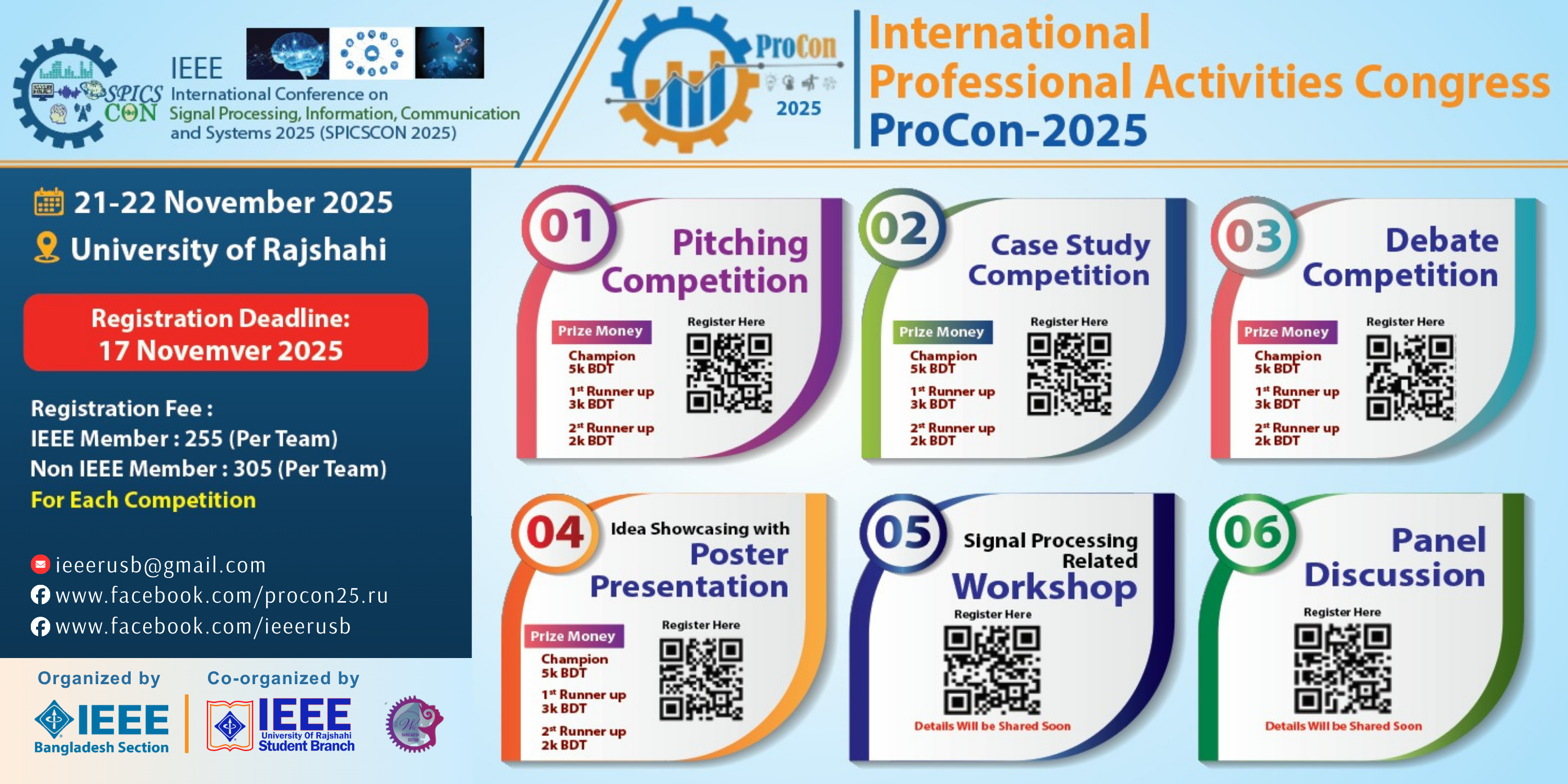 Organized by IEEE Bangladesh Section and co-organized by IEEE University of Rajshahi Student Branch & IEEE WIE AG Bangladesh Section, this year’s ProCon promises an extraordinary blend of creativity, technology, and professional excellence.