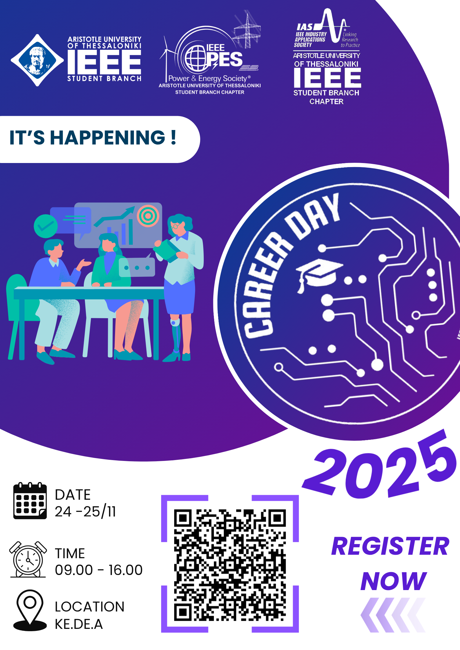 The IEEE Aristotle University Thessaloniki Career Day is a two-day event designed for students in the Department of Electrical and Computer Engineering, as well as anyone interested in the technology sector. The event features technology companies from Greece and abroad, showcasing their projects, internship programs, and full-time employment opportunities.