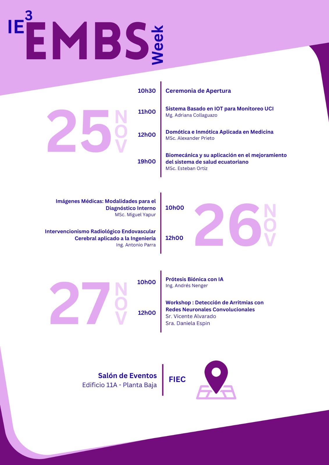 La EMBS Week ESPOL es un evento académico organizado por el capítulo estudiantil IEEE EMBS ESPOL, que reúne a docentes, expertos y estudiantes para explorar los avances y aplicaciones de la ingeniería en la biología y la medicina. Durante tres días, se llevan a cabo conferencias y talleres especializados que abarcan áreas como biomédica, telemetría hospitalaria, imágenes médicas, intervencionismo radiológico, inteligencia artificial aplicada a la salud y desarrollo de tecnologías asistivas.