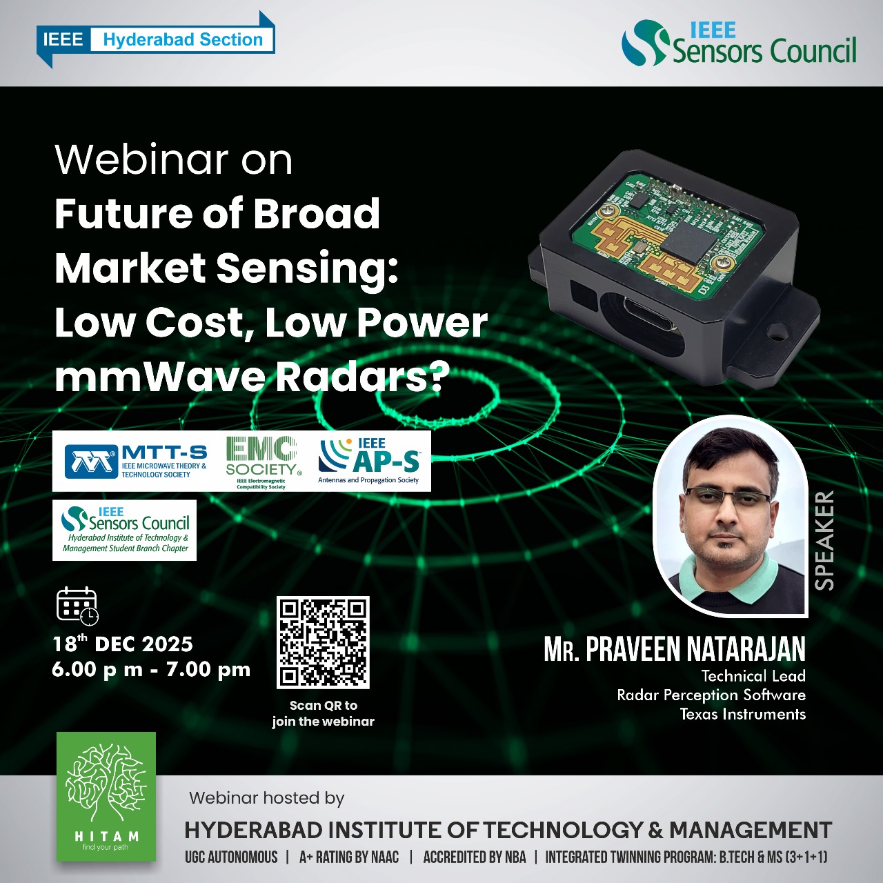 IEEE SENSORS COUNCIL Hyderabad Chapter Presents a webinar on "Future of Broad Market Sensing: Low Cost, Low Power mmWave Radars?"